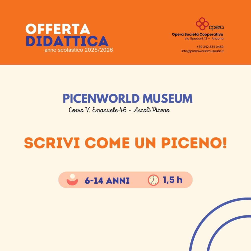 Conosceremo la scrittura dei Piceni decifrando parole misteriose legate a oggetti presenti all’interno del museo. Dopo averne compreso l’uso, useremo l’alfabeto piceno per scrivere il nostro nome e ci divertiremo a comunicare come gli antichi abitanti del territorio.