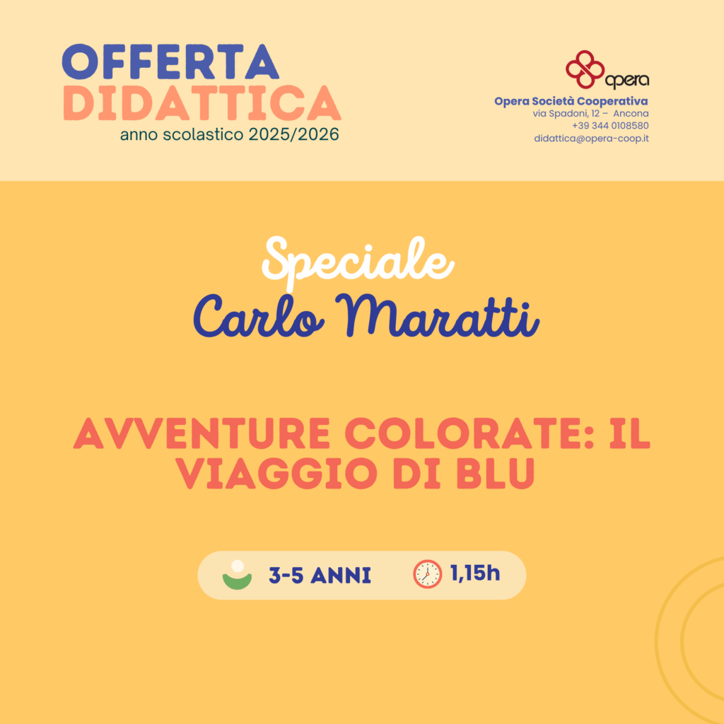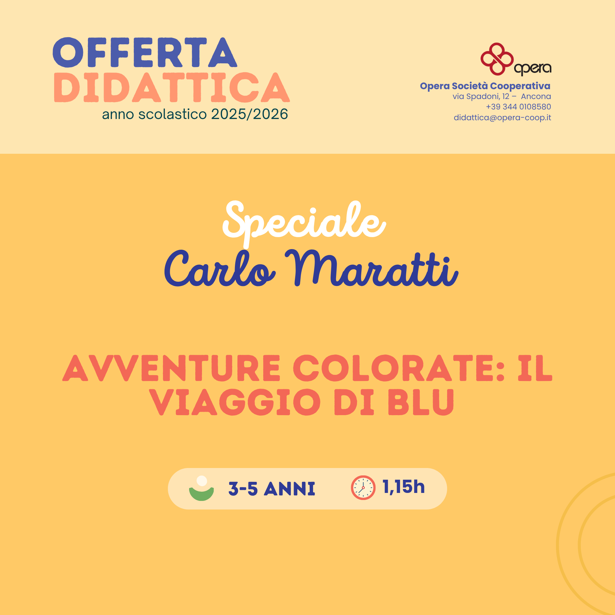 Descrizione: Una lettura animata del libro Il Viaggio di Blu, ideato dal nostro staff per bambini dai 3 ai 5 anni. Attraverso le avventure del colore Blu, i piccoli scopriranno come nascono i colori secondari e complementari, e conosceranno l’illustre pittore cameranese Carlo Maratti.